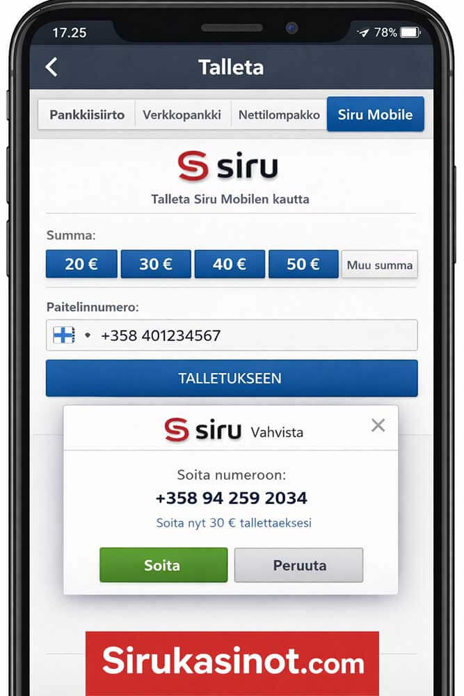 Siru kasino talletus tehdään valitsemalla kassalla Siru Mobile, syöttämällä puhelinnumero ja vahvistamalla maksu tekstiviestillä tai puhelulla. Talletus näkyy pelitilillä heti, ja veloitus tulee myöhemmin puhelinlaskulle.